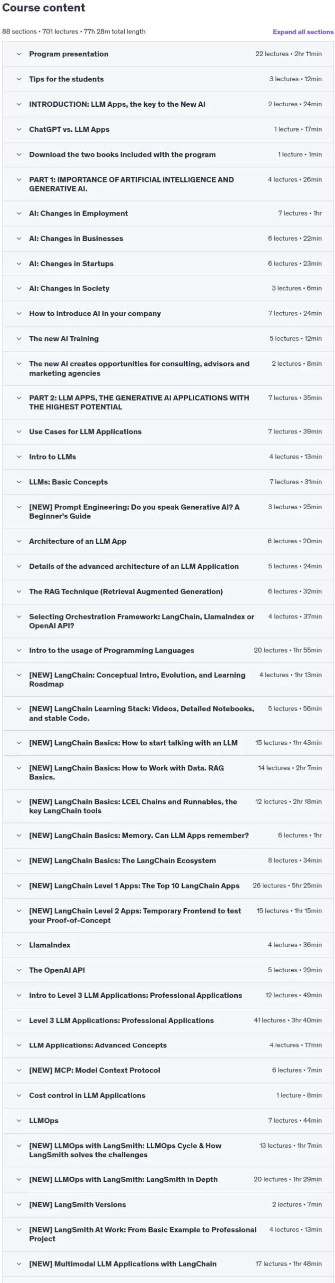 The program begins with foundational concepts of artificial intelligence and generative AI, exploring how these technologies transform businesses, startups, and job markets. Learners then progress into building professional LLM-powered applications, gaining hands-on experience with real-world architectures, tools, and deployment workflows.